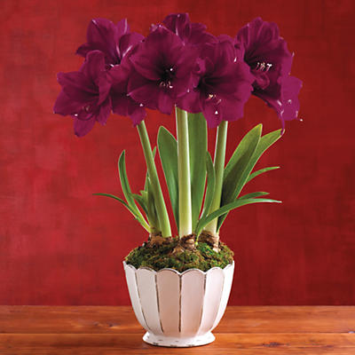 Item description: This Flowers and Plants product is by Harry & David - This limited edition amaryllis plant gift features three types of this colorful flower-a benfica, a minerva, and a vera-ranging in hue from deep cranberry to warm pink. These gorgeous amaryllis flowers arrive pre-planted in individual tins set in a vintage box with metal fretwork, and are suitable for USDA hardiness zones 8b through 10. They prefer full sun, or bright light if kept indoors.
